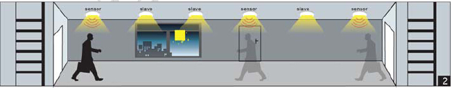 走廊的燈是由幾個(gè)感應(yīng)器控制的。只要有一個(gè)感應(yīng)器感應(yīng)到運(yùn)動(dòng)信號(hào),就會(huì)把信號(hào)傳輸給連接在一起的其他感應(yīng)器,然后所有燈同時(shí)亮。