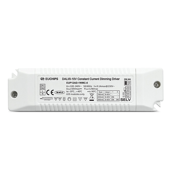 EUP12AD-1WMC-0是一款寬電壓輸入,可以提供180/240/300mA三檔電流的LED驅(qū)動器。輸出電流可以通過DIP撥碼開關(guān)簡易設(shè)置,符合DALI標(biāo)準(zhǔn)協(xié)議IEC62386。支持DALI,0-10V有源信號,可調(diào)電阻,PWM, Touch DIM 多種調(diào)光方式。