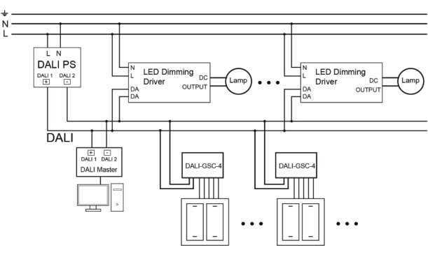 ●每個(gè)獨(dú)立的DALI 回路電流不得超過(guò)250mA,每個(gè)回路的電源和控制器數(shù)量不得超過(guò)64個(gè)。
