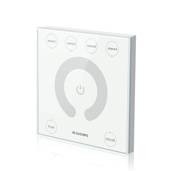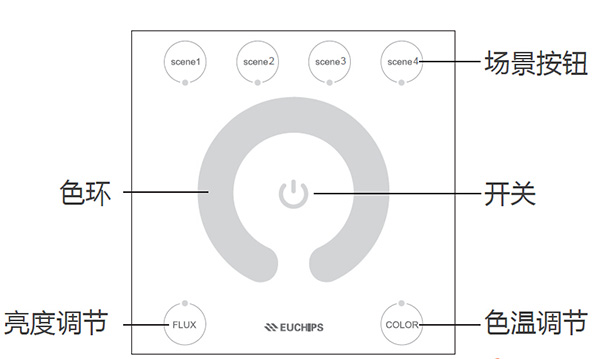 Flux:打開(kāi)面板時(shí),F(xiàn)lux默認(rèn)為激活狀態(tài)。色環(huán)可調(diào)節(jié)燈具的亮度,沿環(huán)順時(shí)針觸摸色環(huán),燈具的亮度將逐漸增加;沿環(huán)逆時(shí)針觸摸色環(huán),燈具的亮度將逐漸減小。最暗為5%的亮度,最亮為100%。