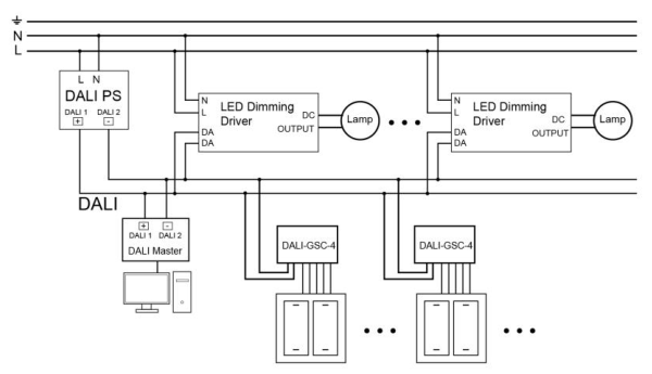 DALI分組-場景控制器-DALI-GSC-4 供電電源:通過DALI總線供電