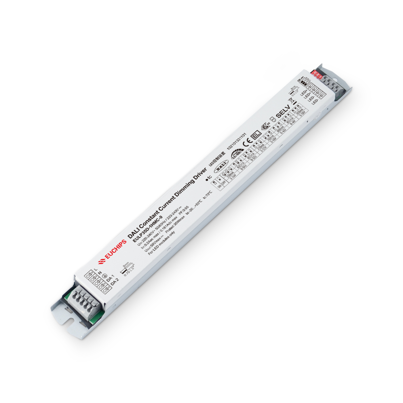 EULP35D-1HMC-0是一款交流變直流LED驅(qū)動(dòng)器,輸出電流可以通過DIP開關(guān)選擇,符合DALI標(biāo)準(zhǔn)協(xié)議IEC62386。連接DALI主控或Touch DIM可以實(shí)現(xiàn)平滑的調(diào)光效果。
