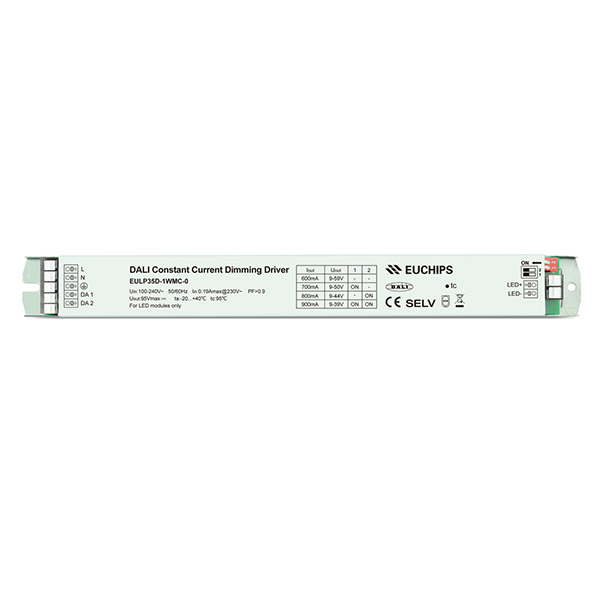 EULP35D-1WMC-0一款35W交流變直流LED調(diào)光電源,輸出電流可以通過DIP開關(guān)選擇,符合DALI標(biāo)準(zhǔn)協(xié)議IEC62386。連接DALI主控或Touch DIM可以實(shí)現(xiàn)平滑的調(diào)光效果。