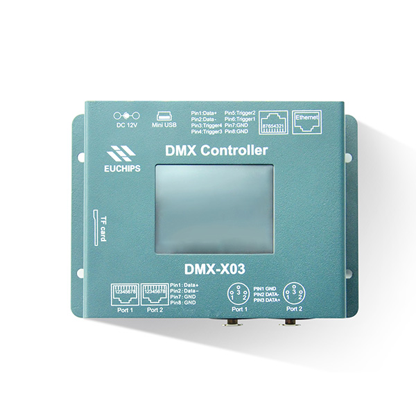 EUCHIPS? DMX-X03是一套用于控制建筑室內(nèi)外亮化的全彩LED DMX控制系統(tǒng),可以在聯(lián)機和獨立兩種模式下工作。它包含場景編輯程序,根據(jù)不同的需求可以通過電腦下載的程序編輯各種燈光效果。該控制系統(tǒng)實現(xiàn)R,G,B各256級灰度,共可表現(xiàn)1677萬種顏色,真正顯示全彩色。