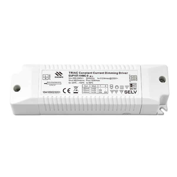 EUP15T-1HMC-0是一款可以提供280/350/380/450mA四檔電流的LED驅動器。這款驅動器支持前沿切相和后沿切相調光器,可以與兼容多品牌系統(飛利浦,ABB,路創(chuàng),西門子,西蒙,松下,邦奇等)配合使用,調光曲線平滑。