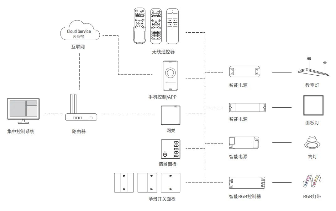 - 通過接入DALI接口的專用控制器或執(zhí)行器實現(xiàn)智能化控制