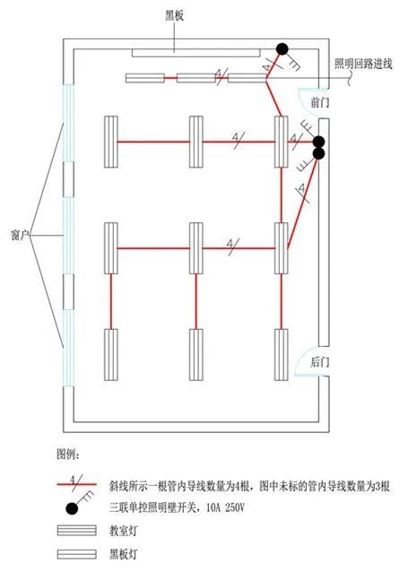 調(diào)光系統(tǒng)分多個(gè)回路控制。教室照明燈具第一橫排的每個(gè)燈具應(yīng)由單獨(dú)回路開(kāi)關(guān)控制,在使用多媒體教學(xué)時(shí),可分別調(diào)節(jié)照明,照度。其余每一縱列燈具由獨(dú)立回路開(kāi)關(guān)控制,如下圖: