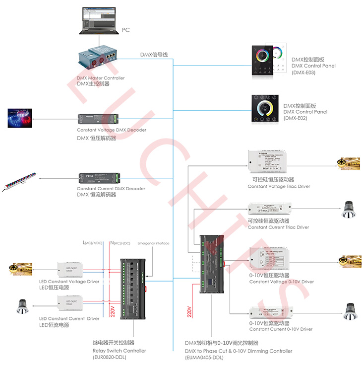 下圖是上海歐切斯實(shí)業(yè)有限公司的DMX控制系統(tǒng)實(shí)物圖。圖中dmx恒壓解碼器和dmx恒流解碼器均對(duì)應(yīng)為上圖中的dmx512控制器。