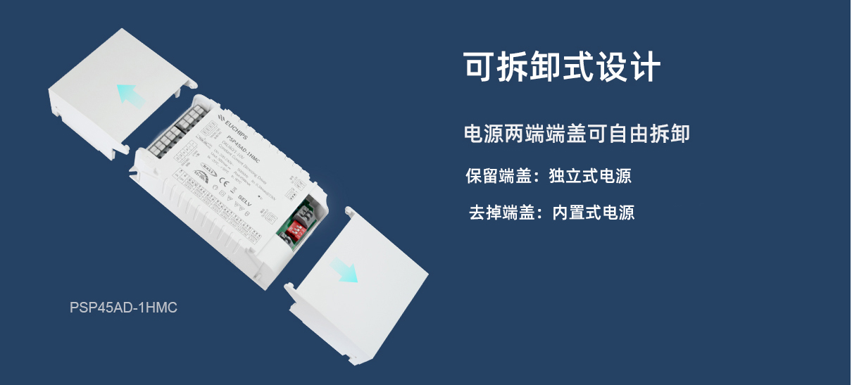 PSP45AD-1HMC 電源兩端端蓋可以自由拆卸,保留端蓋可以作為獨立式電源使用,去除端蓋后可以作為內(nèi)置式電源使用。
