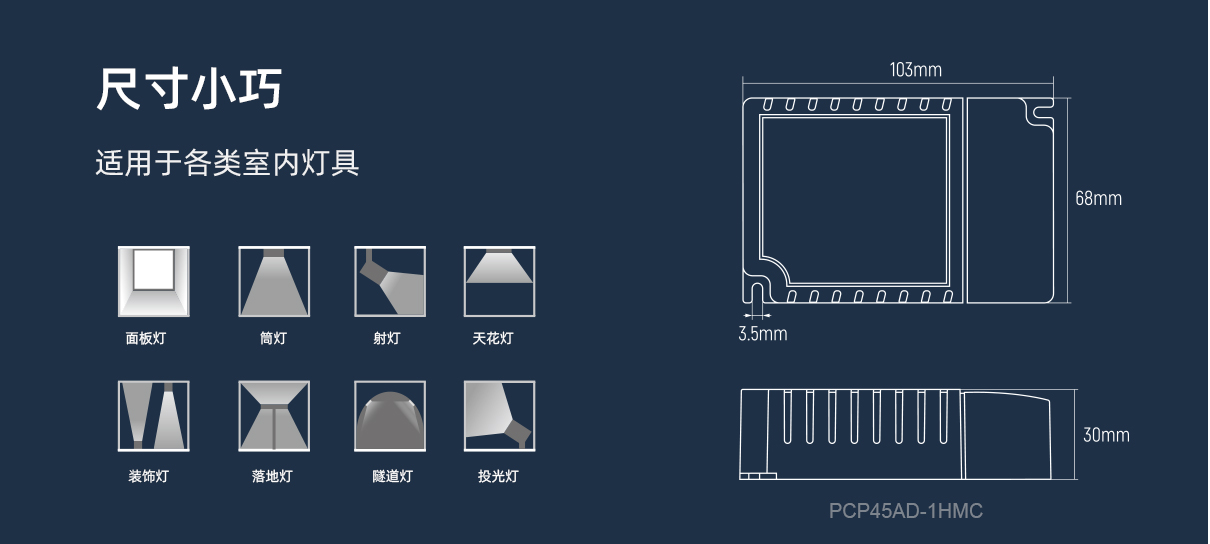 這兩款調(diào)光電源尺寸小巧,適用于各種室內(nèi)LED燈具,PCP45AD-1HMC尺103*68*30mm,可以內(nèi)置于面板燈內(nèi)部。