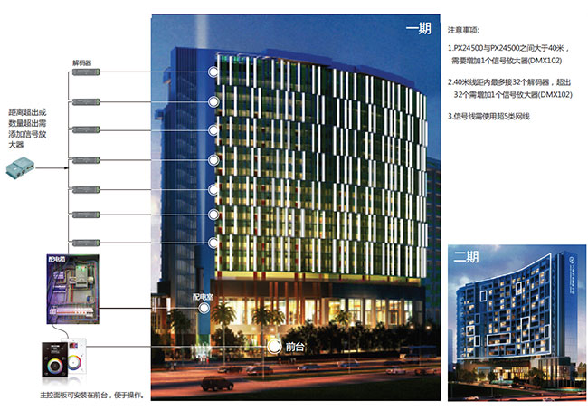 在這個(gè)三亞力合酒店目中,歐切斯Euchips選用的是DMX-P06控制器,根據(jù)不同的需求,通過程序編輯各種燈光效果??梢詫?shí)現(xiàn)R,G,B各256級(jí)灰度,共可表現(xiàn)1677萬種顏色,實(shí)現(xiàn)全彩色。配合使用將DMX-512/1990標(biāo)準(zhǔn)數(shù)碼控制信號(hào)轉(zhuǎn)換成模擬控制信號(hào)的解碼器PX24500,以及遠(yuǎn)距離信號(hào)傳輸?shù)男盘?hào)放大器DMX102。實(shí)現(xiàn)酒店建筑的立面照明效果。