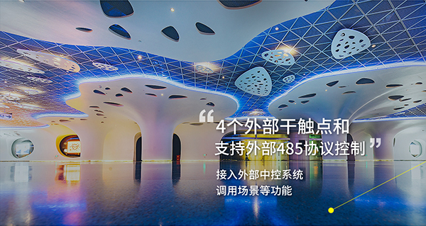 1. 4個(gè)外部干觸點(diǎn)方便外接中控系統(tǒng),外部干觸點(diǎn)支持外部485協(xié)議控制,可以方便的對(duì)接其他中控系統(tǒng)來(lái)調(diào)用場(chǎng)景等功能。