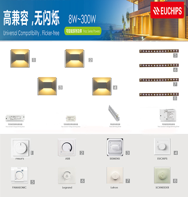 采用不同品牌的主控旋鈕(飛利浦,ABB,西門子,正泰,德力西,松下,施耐德,羅格朗)與歐切斯可控硅調(diào)光電源的匹配調(diào)光效果。歐切斯獨(dú)家的可控硅技術(shù)解決了可控硅的兼容性問題:調(diào)光時(shí)有噪音,有最低負(fù)載要求,調(diào)光范圍窄這些痛點(diǎn),支持前后沿切相調(diào)光,兼容性好,支持絕大部分的主控品牌,調(diào)光范圍寬,能根據(jù)主控的特性來(lái)修改調(diào)光曲線,沒有最低負(fù)載要求。
