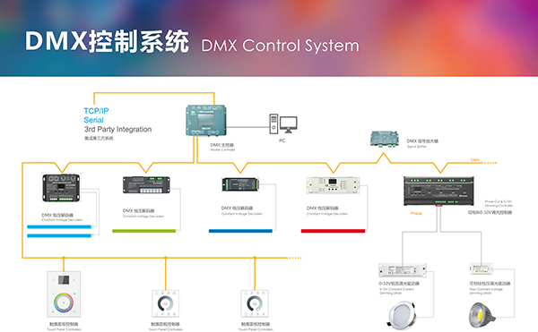 DMX系統(tǒng)中的多種調(diào)光控制面板,多通道的解碼器,以及DMX和傳統(tǒng)0-10V,切相調(diào)光的轉(zhuǎn)換器。具備頻率切換功能的解碼器,能滿足了客戶無(wú)頻閃的需求。全新的主控,植入外部485協(xié)議和干觸點(diǎn)的功能,銜接第三方中控系統(tǒng),主控還滿足局域網(wǎng)多臺(tái)互聯(lián)的功能,保證了輸出效果的同步性。