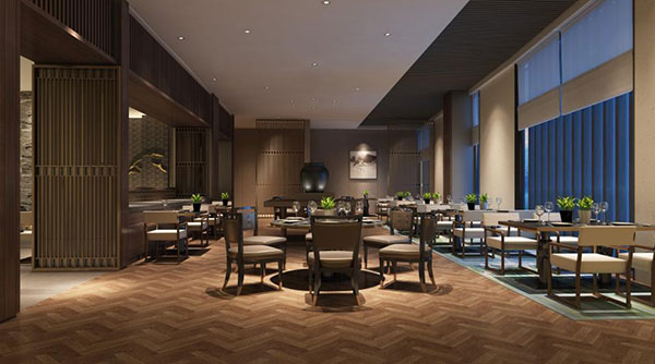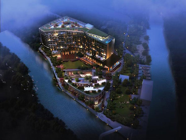 酒店整體風(fēng)格:外部內(nèi)斂典雅,一高一低兩幢主體建筑臨河而建,相望而立,呈現(xiàn)建筑美學(xué)中“太極陰陽魚圖”的形狀。