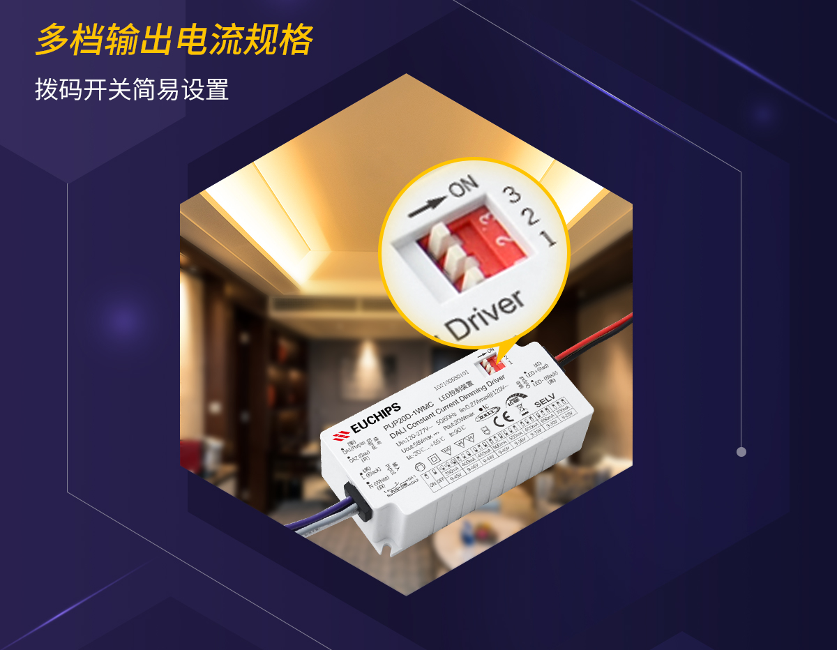 此次發(fā)布的調(diào)光電源產(chǎn)品均有3檔撥碼開關(guān),8檔電流可以選擇。20W輸出電流:350-700mA,40W輸出電流:500-1200mA,可以匹配多種恒流燈具調(diào)光。