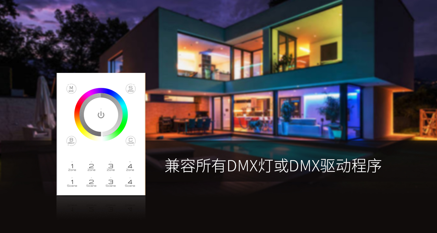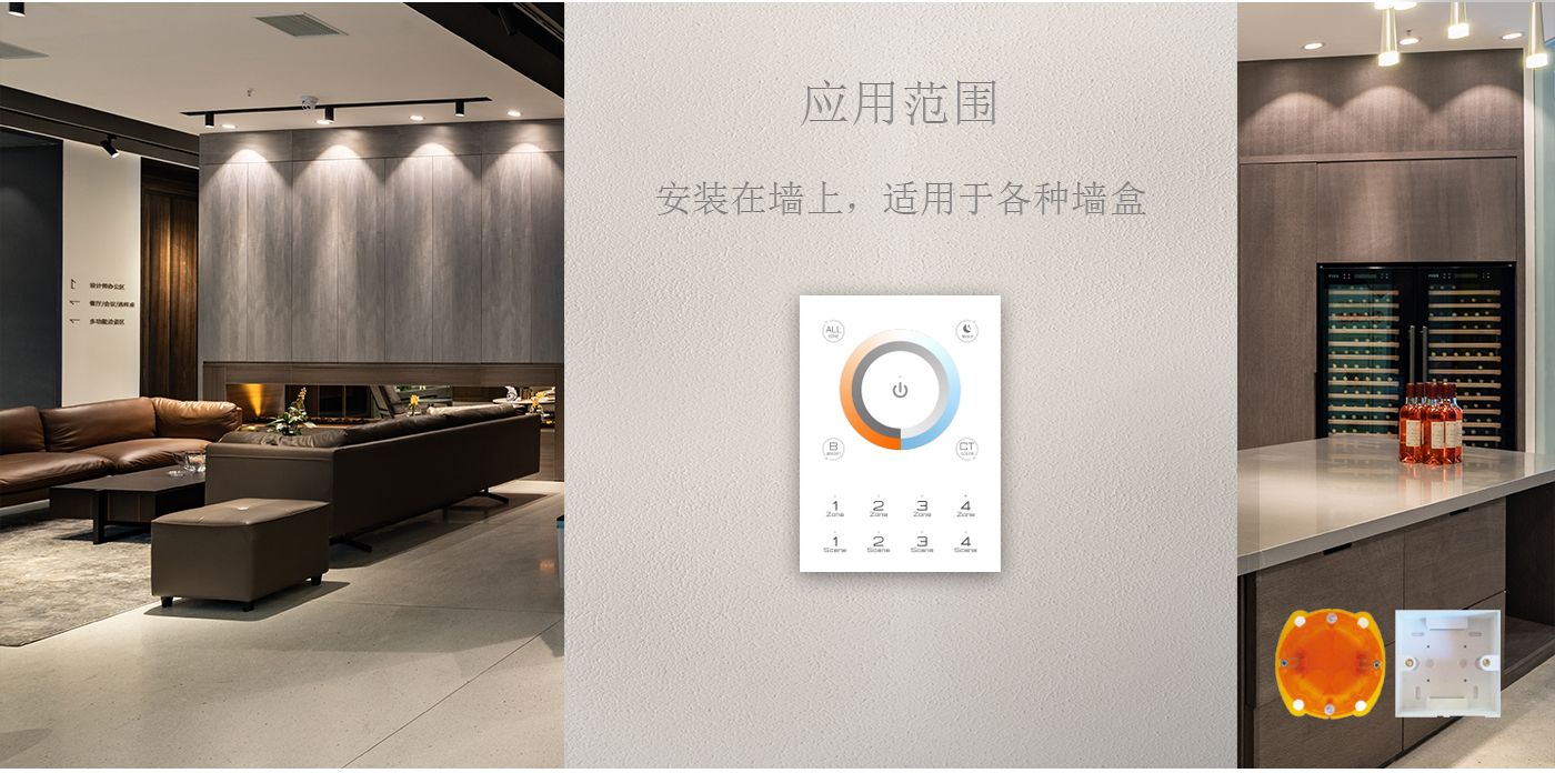 調(diào)光控制器面板有兩種類(lèi)型,長(zhǎng)形款:146*106*11(mm),方形款:86*86*10(mm) 安裝于墻面,適用于各種墻盒,應(yīng)用范圍廣泛。 除此之外,歐切斯DMX512主控軟件自行開(kāi)發(fā)可編程,可實(shí)現(xiàn)燈具豐富的色彩變化效果。