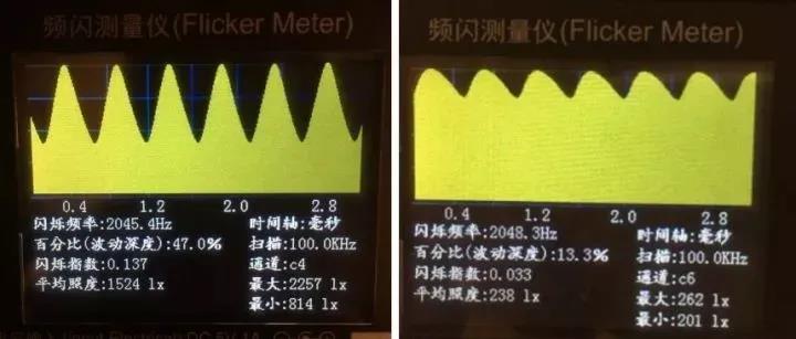 相對(duì)于LED照明產(chǎn)品而言,調(diào)光是其必備的功能,而調(diào)光恰恰是導(dǎo)致頻閃的一個(gè)誘因。而此當(dāng)產(chǎn)品加載調(diào)光功能時(shí),頻閃往往會(huì)進(jìn)一步加劇。特別是在調(diào)光較暗時(shí),其波動(dòng)深度比較大。對(duì)于具有調(diào)光功能或者宣稱可連接調(diào)光控制器的照明產(chǎn)品,應(yīng)該在其分別在調(diào)光最亮以及調(diào)光較暗時(shí)測(cè)量其頻閃表現(xiàn)。