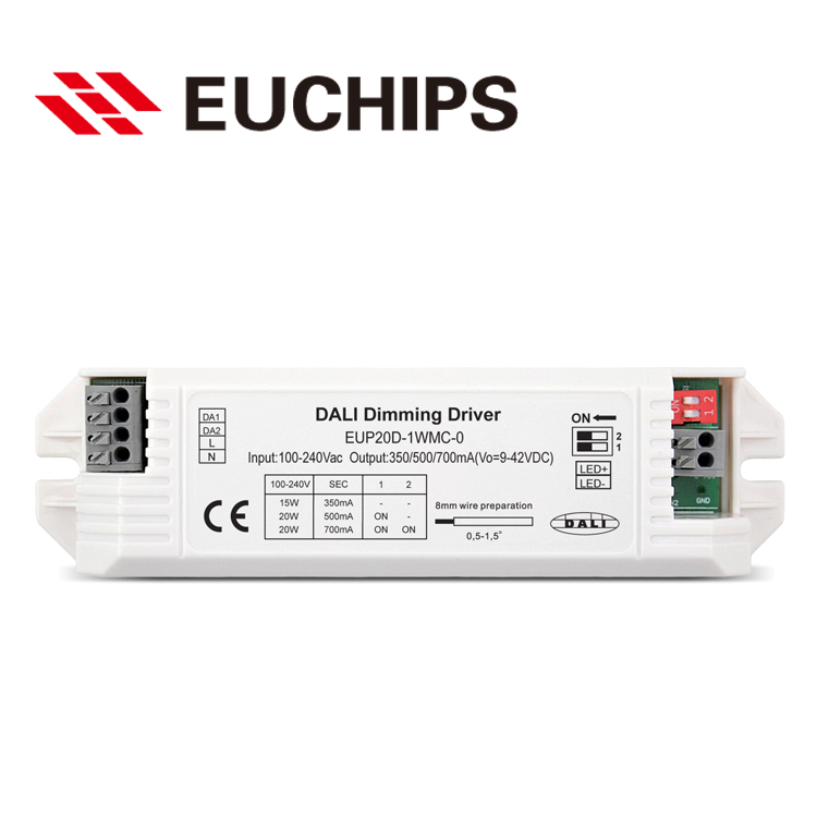 圖2為歐切斯新款DALI調(diào)光電源產(chǎn)品EUP20D-1WMC-0,100-240VAC高壓輸入,3-42VDC低壓輸出,350/500/700mA輸出電流可選,恒功率20W。支持Touch-DIM功能內(nèi)建主動(dòng)式PFC功能。