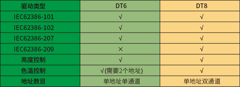 調(diào)光需要一個通道來實(shí)現(xiàn)控制,調(diào)色溫也需要一個通道來實(shí)現(xiàn)控制,同時調(diào)光和調(diào)色溫則需要兩個通道來實(shí)現(xiàn)。DT6驅(qū)動程序是單地址單通道,如果需要調(diào)光調(diào)色溫,則需要兩個地址來控制;DT8驅(qū)動程序是單地址雙通道,如果調(diào)光調(diào)色溫,一個地址來控制即可。