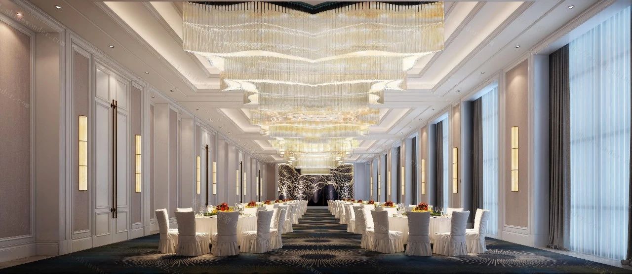 酒店宴會(huì)廳多用于商務(wù)接待或一些較為正式的宴請(qǐng),所以照明的整體氣氛是莊重的、友好的,它的一般照明亮度要高出許多,且應(yīng)該是均勻的,能滿足各種應(yīng)用場(chǎng)景需求。