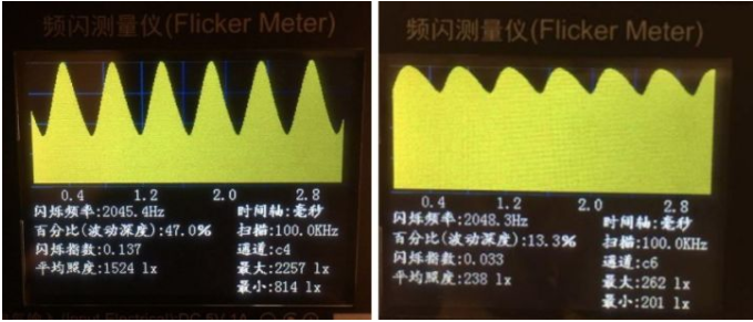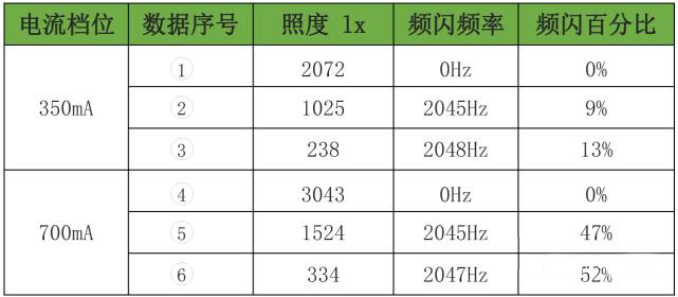 不調光時,頻閃幾乎為零。調暗時,驅動采用2K Hz的高頻調制,數據落在無影響區(qū)域,可叫做“無頻閃”。