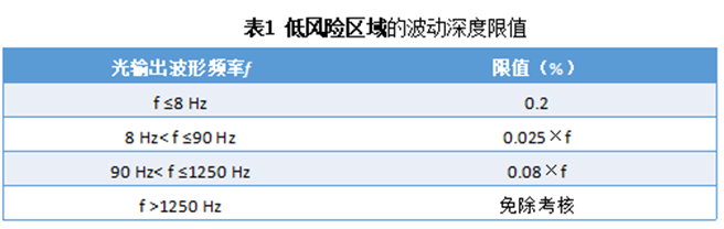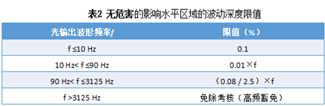 (表1和表2 則列出低風險和無危害區(qū)域,燈具頻閃百分比(波動深度)的限值。