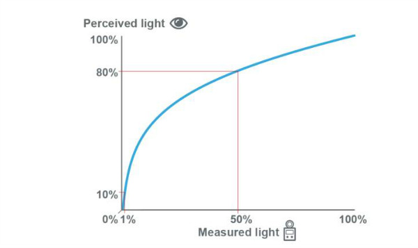 由于人眼對光線的敏感區(qū)域是25%以下范圍。這意味著:實(shí)際我們測量的光強(qiáng)度與我們感知到的光強(qiáng)度之間存在差異。